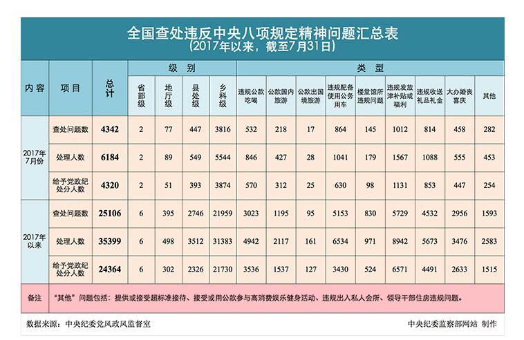 为掌握全国贯彻落实中央八项规定精神情况,中央纪委在31个省区市和新疆生产建设兵团、139个中央和国家机关、102个中央企业、15个中央金融企业建立了落实中央八项规定精神情况月报制度。2017年以来,截至7月31日,全国查处违反中央八项规定精神问题情况如下: