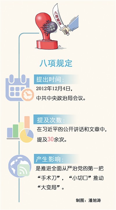 这短短600多字的八项规定,被称作推进全面从严治党的第一把“手术刀”。这把“手术刀”所针对的病灶,则是被称作“四风”的4种坏现象——形式主义、官僚主义、享乐主义和奢靡之风。3年来,中央和各级纪检监察机关坚持一个节点一个节点地抓,持续在节日前后通报曝光一批典型案例,累计查处违反八项规定精神问题逾10万起。党风政风民风的变化,让人民看到了以习近平同志为总书记的党中央全面从严治党的决心。
