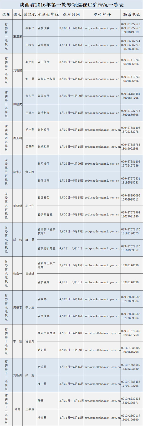 2016年陕西省委第一轮专项巡视动员部署暨培训会近日召开。根据统一部署,省委12个巡视组,采取“一托二”的方式对省发改委、省旅游局、省工信厅、省知识产权局、省公安厅、省法制办、省财政厅、省地税局、省司法厅、省信访局、省国资委、省供销总社、省民委(省宗教局)、省政府研究室、省新闻出版广电局、省质监局、省编办、省网信办,西安市阎良区、略阳县、定边县、横山县、佳县、清涧县等24个地区、单位开展巡视,并对外公布巡视受理范围和工作联系方式等。截至目前,各巡视组已全部进驻。