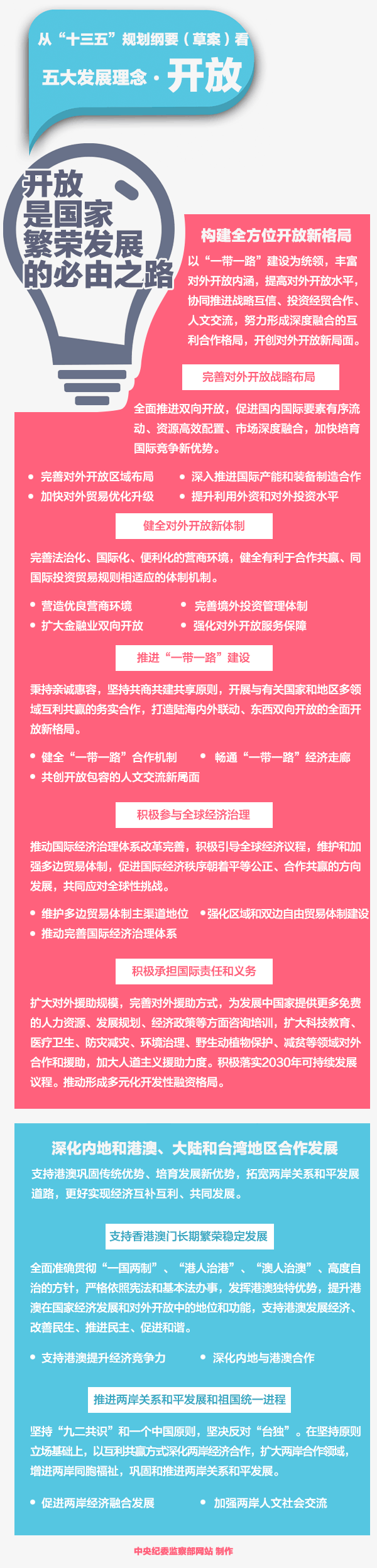 五中全会提出的开放发展理念具有丰富深刻的内涵。完善对外开放战略布局、形成对外开放新体制、推进“一带一路”建设、积极参与全球经济治理,这些宏大的战略部署既向世界宣告了中国对外开放的大门永远不会关上的鲜明态度,也向世界展示了崛起中的中国将勇于承担更大责任的胸怀和担当。