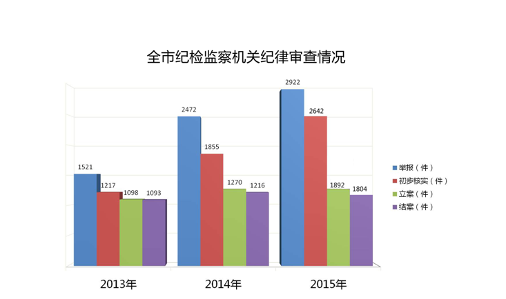 2015年,全市纪检监察机关继续强化监督执纪问责这一主业,保持严惩腐败的强劲势头,市县两级自办案件数量大幅提升,初核、立案和处分人数同比分别增长了33.5%、35.7%和38.5%。其中,县处级立案17件,处分18人,乡科级立案296件,处分290人。