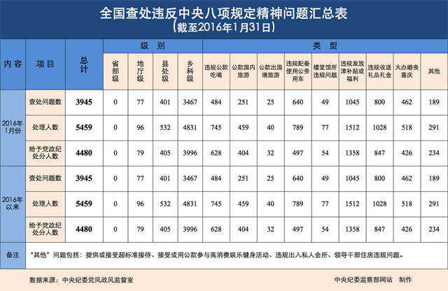 记者2月21日从中央纪委党风政风监督室获悉,今年1月,全国共查处违反中央八项规定精神问题3945起,处理5459人,给予党纪政纪处分4480人。