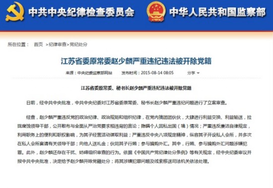 2015年8月14日,江苏省委原常委赵少麟因严重违纪违法被开除党籍。在中央纪委发布的纪律处分通报中,赵少麟被指严重违反党的政治纪律、政治规矩和组织纪律,在党内搞团团伙伙,大肆进行利益交换、利益输送,拉拢腐蚀领导干部,公开散布与全面从严治党要求相违背的言论。