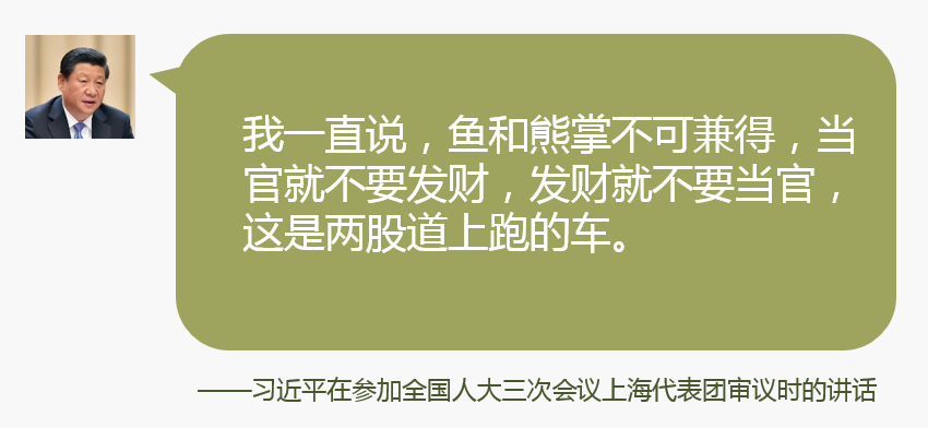 我一直说,鱼和熊掌不可兼得,当官就不要发财,发财就不要当官,这是两股道上跑的车。对领导干部配偶和子女等经商办企业,党纪国法都有明确规定,问题是没有落实好。对领导干部,要求就是要严一些,正所谓“其身正,不令而行;其身不正,虽令不从”。