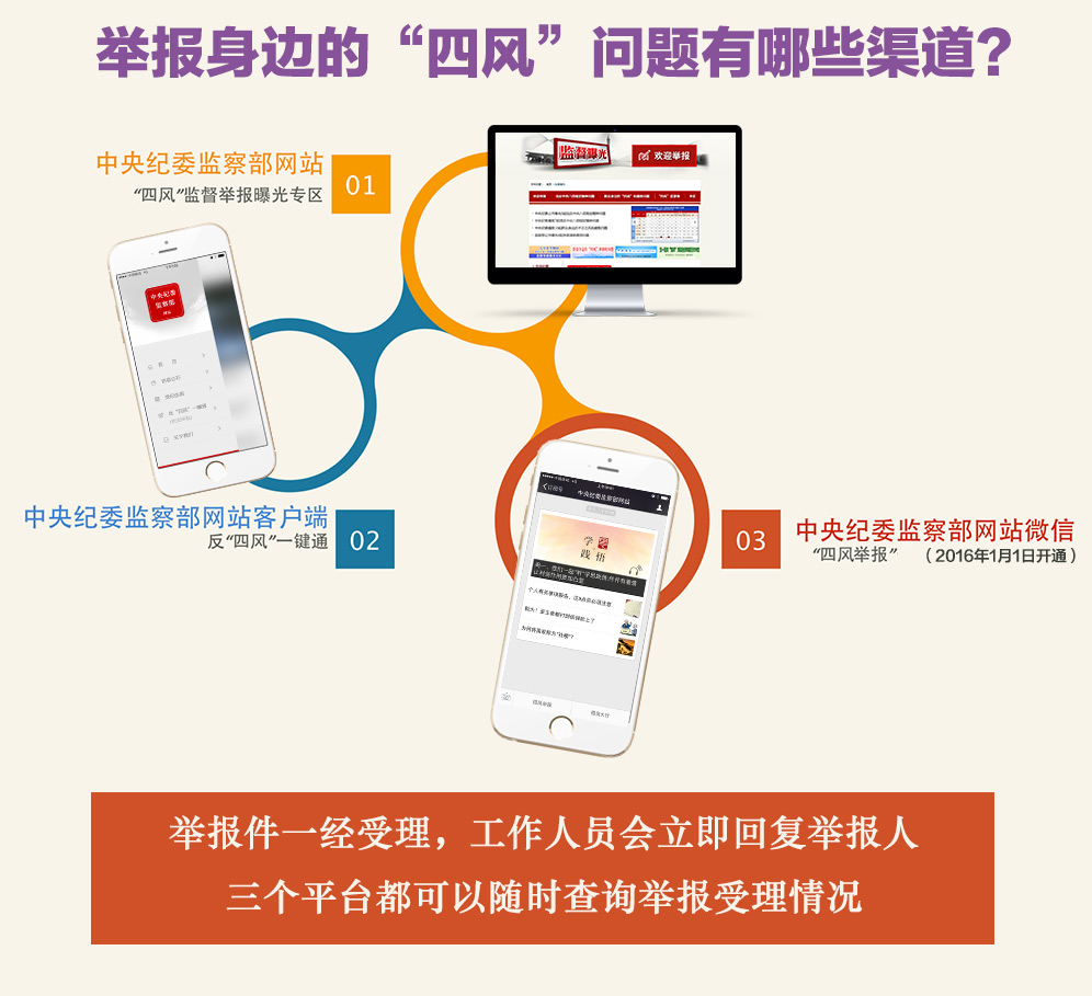 目前,中央纪委党风政风监督举报平台已形成了中央纪委监察部网站“四风”监督举报曝光专区、手机客户端“反‘四风’一键通”和微信“四风举报”组成的“一网一端一微”格局。