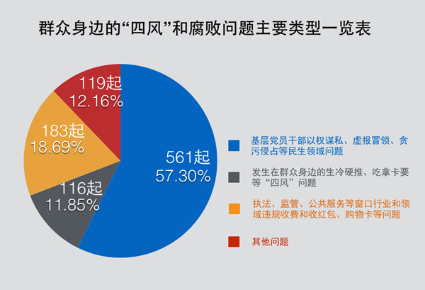 基层党员干部就生活在群众当中,其一言一行、一举一动都直接关乎党的形象。在通报的979起问题中,发生在群众身边的生冷硬推、吃拿卡要、与民争利、欺压百姓等“四风”问题116起,占通报总数的11.8%。执法、监管、公共服务等窗口行业和领域违规收费和收红包、购物卡等问题共通报183起,占通报总数的18.6%。两者皆为不正之风,合计达问题总数三成。