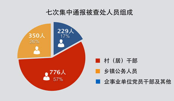 从被查人员组成来看,在中央纪委监察部网站点名道姓通报曝光的1355人中,违纪违法人员主要包括村(居)干部776人、乡镇公务人员350人、企事业单位党员干部及其他229人。