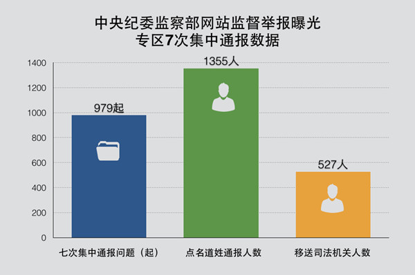 自2015年7月6日进行首次通报以来,中央纪委监察部网站“群众身边的‘四风’和腐败问题”监督举报曝光专区共通报问题979起,点名道姓通报1355人,其中527人移送司法机关。