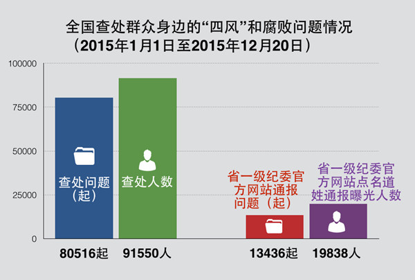 综合全国31个省区市和新疆生产建设兵团查处群众身边的“四风”和腐败问题的统计数据,2015年1月1日至2015年12月20日全国共查处群众身边的“四风”和腐败问题80516起,处理91550人。31个省区市和新疆生产建设兵团在省一级纪委官方网站通报问题13436起,点名道姓曝光19838人。