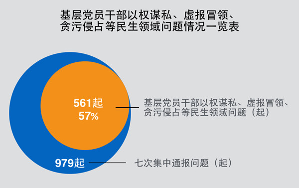 从通报数据看,基层党员干部在土地征收流转、“三资”管理、惠农补贴、扶贫救济、低保医保、旧村改造资金、社会抚养费管理使用方面以权谋私、虚报冒领、贪污侵占等问题共561起,约占通报问题总数的57%。