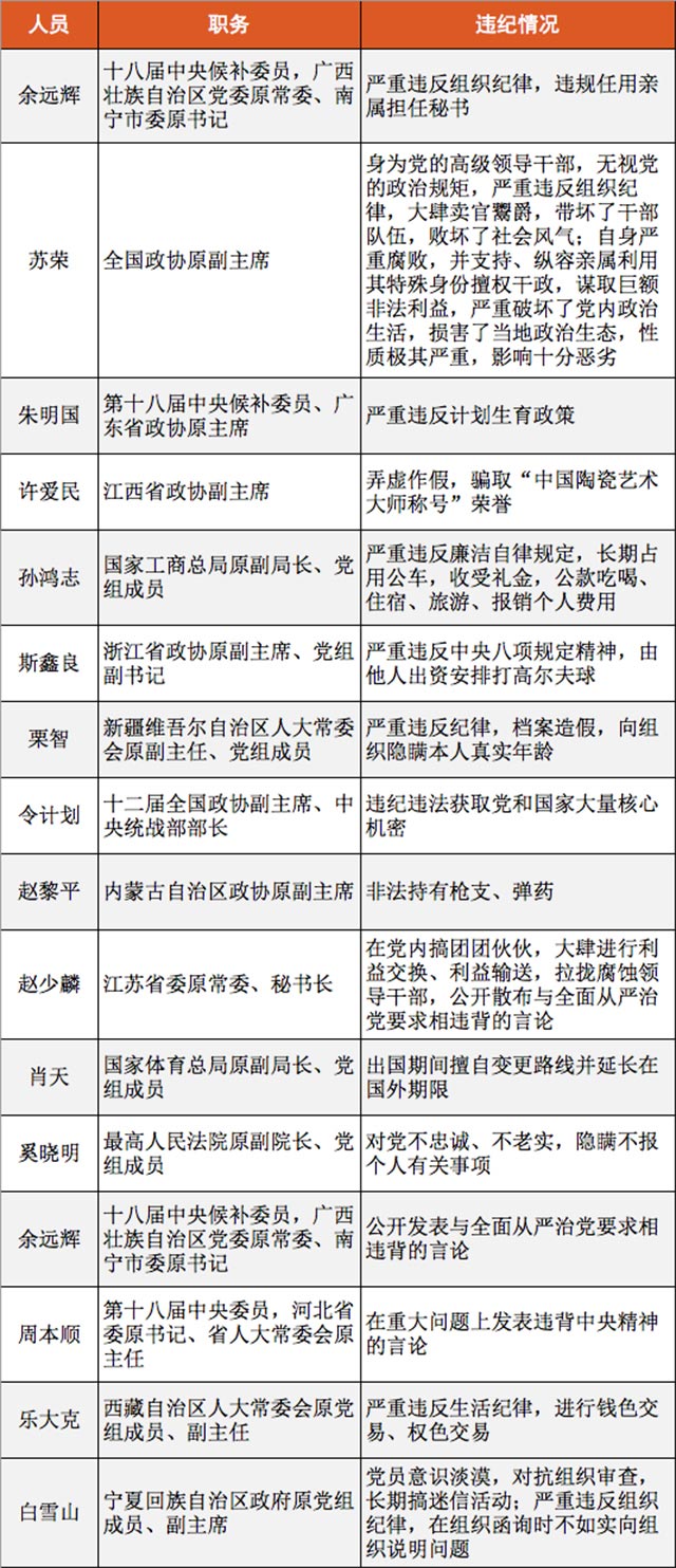 其中,14位领导干部被指“严重违反党的政治规矩”,6位领导干部被指“无视党的政治规矩”,这6人为杨卫泽、朱明国、王敏、陈川平、苏荣、仇和;10人“严重违反党的政治纪律、政治规矩”,分别为令计划、徐建一、赵少麟、令政策、肖天、奚晓明、余远辉、潘逸阳、杨栋梁、周本顺;3人“严重违反党的政治纪律”,分别为谷春立、乐大克、白雪山。
