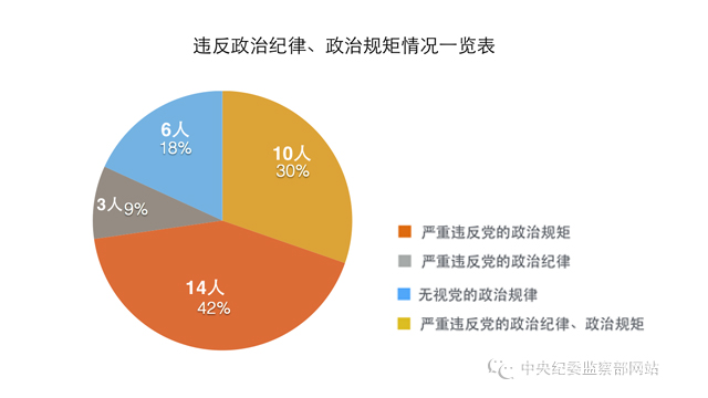 梳理34位领导干部的纪律处分通报,33人都出现了“严重违反党的政治规矩”“无视党的政治规矩”“严重违反政治纪律”“严重违反党的政治纪律、政治规矩”等表述。