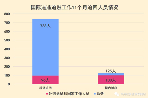 “百名红通”18人到案是代表性成果,但这只是2015年国际反腐败追逃追赃成果的一部分。而国际追逃追赃工作截至2015年11月一共追回了863人,其中党员和国家工作人员196人,从境外追回738人。