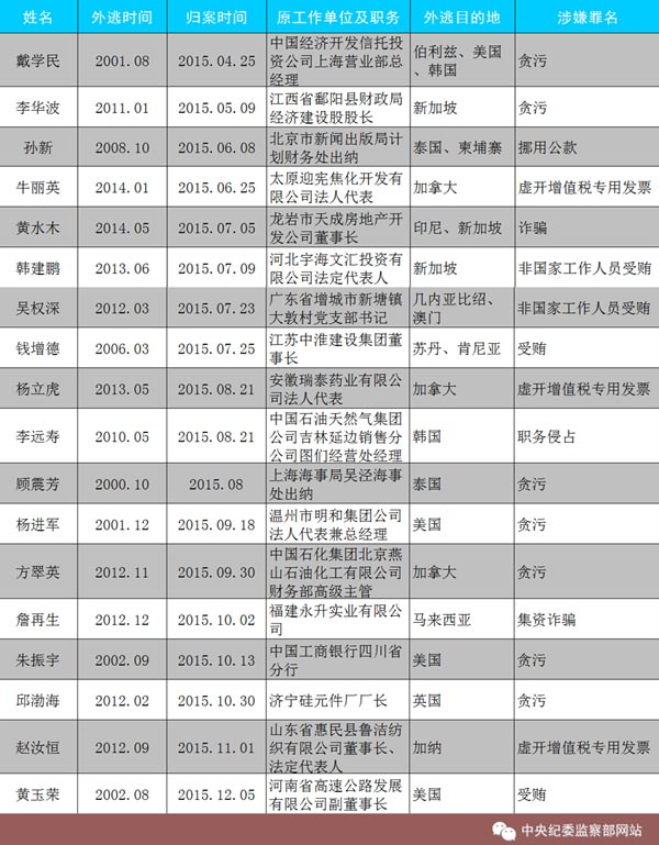 2015年到案的18名“红通”人员都是谁?