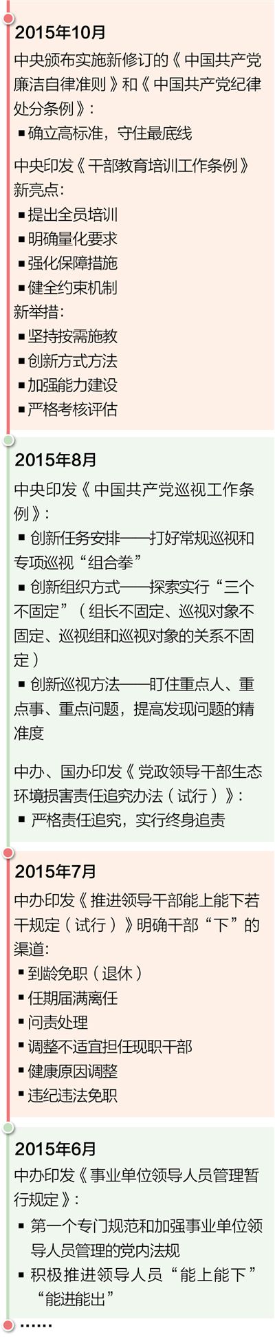 2015年,党内法规制度建设步入快车道。一年来,《中国共产党廉洁自律准则》《中国共产党纪律处分条例》《中国共产党巡视工作条例》《中国共产党党组工作条例(试行)》等一系列党内法规的出台,进一步完善了党内法规体系。党的纪律检查体制改革、党的建设制度改革扎实推进。