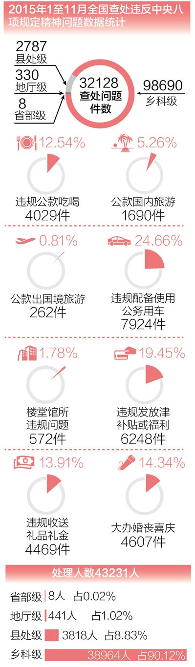 以今年全国查处违反中央八项规定精神问题为例,截至今年11月30日,处理违反中央八项规定精神问题的干部中乡科级占绝大多数,占比九成;查处县处级以上干部问题数和处理人数呈增加趋势,特别是地厅级干部增幅明显。通过不断加大查处力度,释放了越往后执纪越严的信号,使得纪律意识得到不断强化。